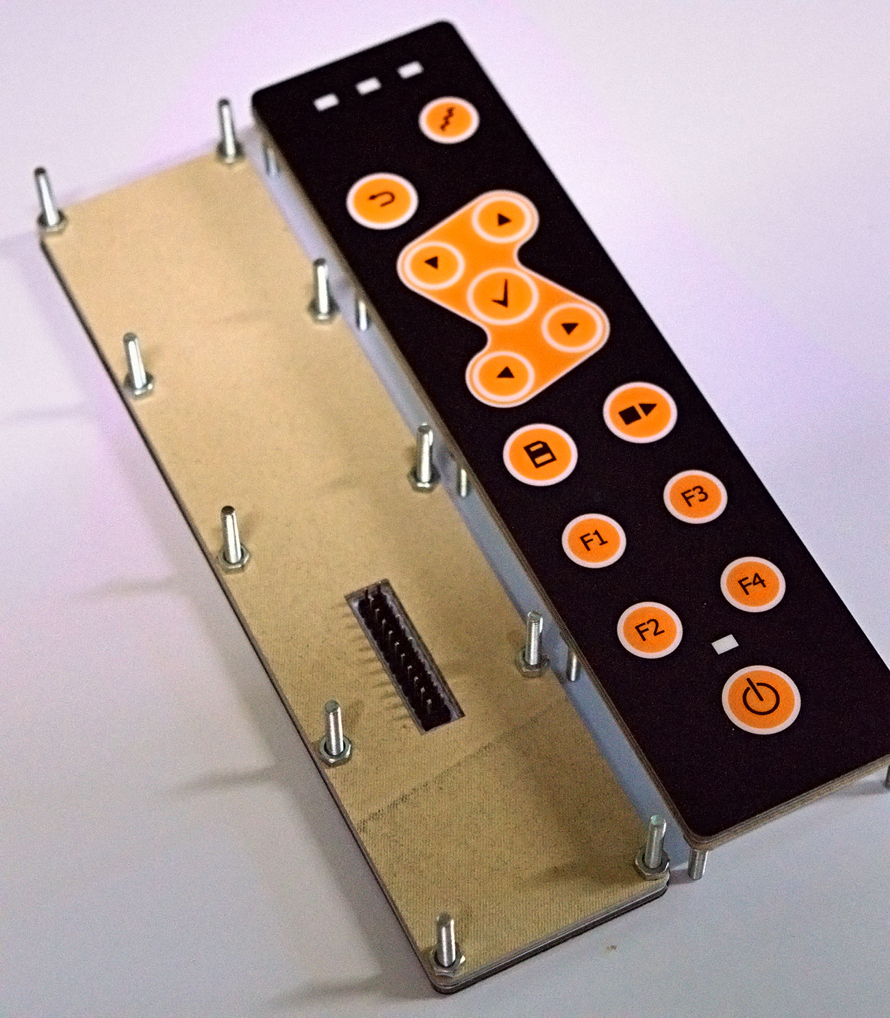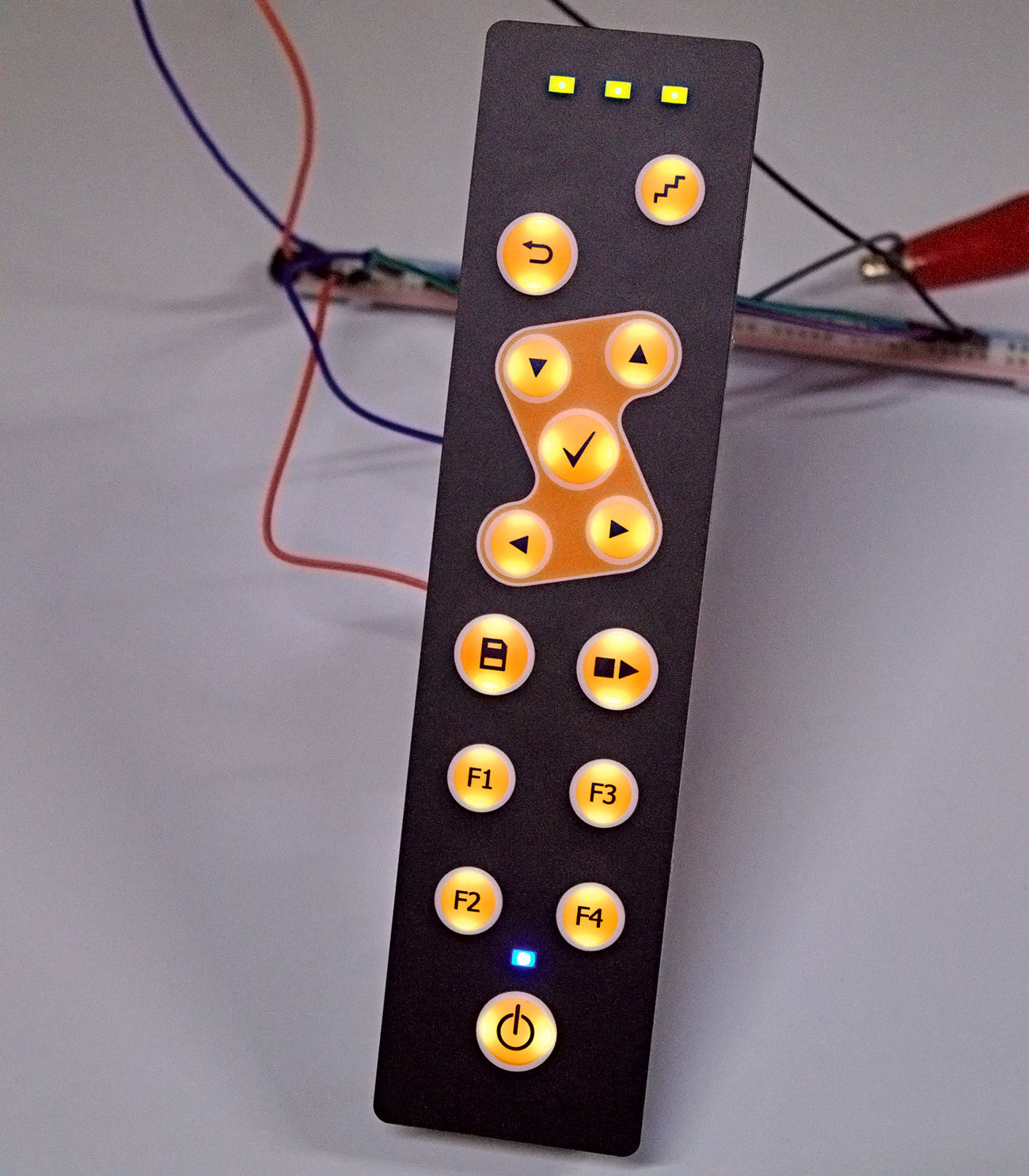 Реализована подсветка клавиш. На одном из индикаторов установлен RGB-светодиод, позволяющий формировать три различных световых сигнала (красный/зеленый/синий) с одной контактной площадки.Подключение: